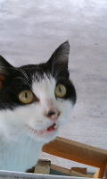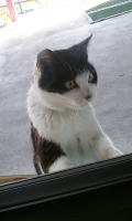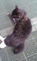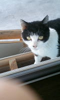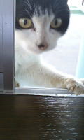 お部屋の中に入りたいにゃ〜。でも、怒られちゃうしにゃ〜・・・でもでも、入りたいにゃ〜。なんとかして入れないかにゃあ〜。